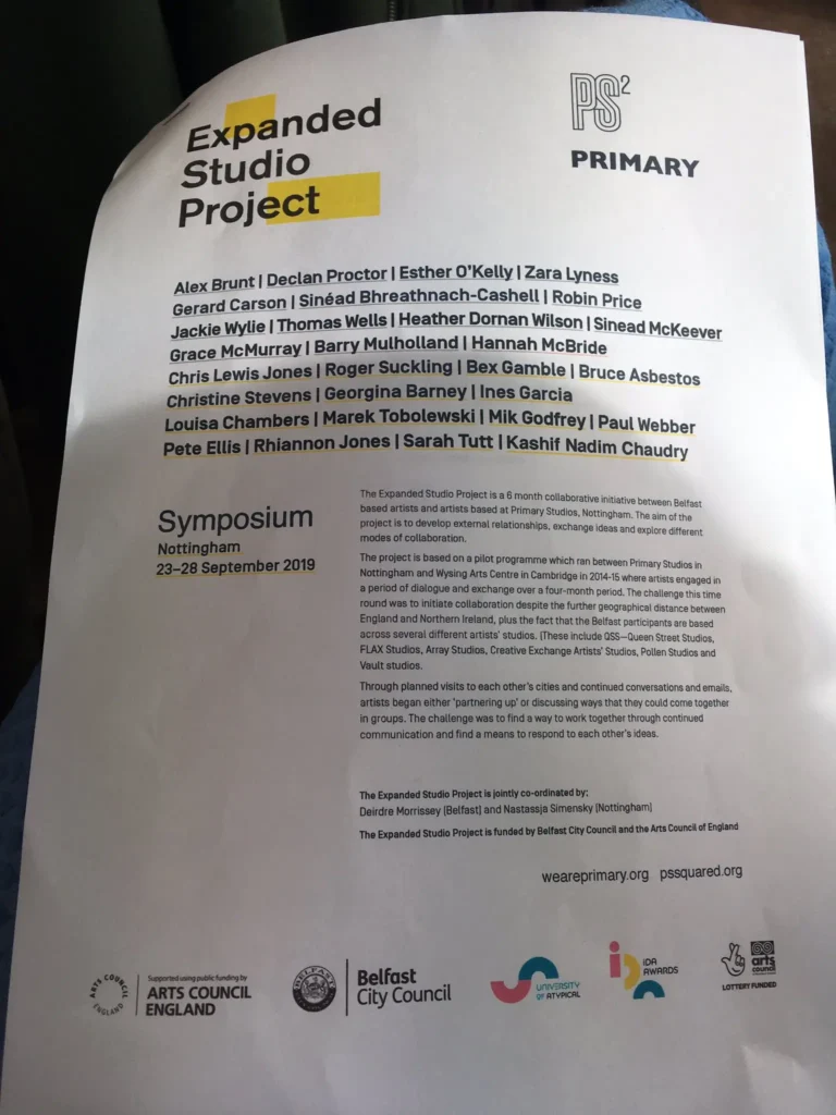 The Expanded Studio Project was a 5 month collaborative initiative between Belfast based artists and artists based at Primary Studios, Nottingham. The aim of the project was to develop external relationships, exchange ideas and explore different modes of collaboration.